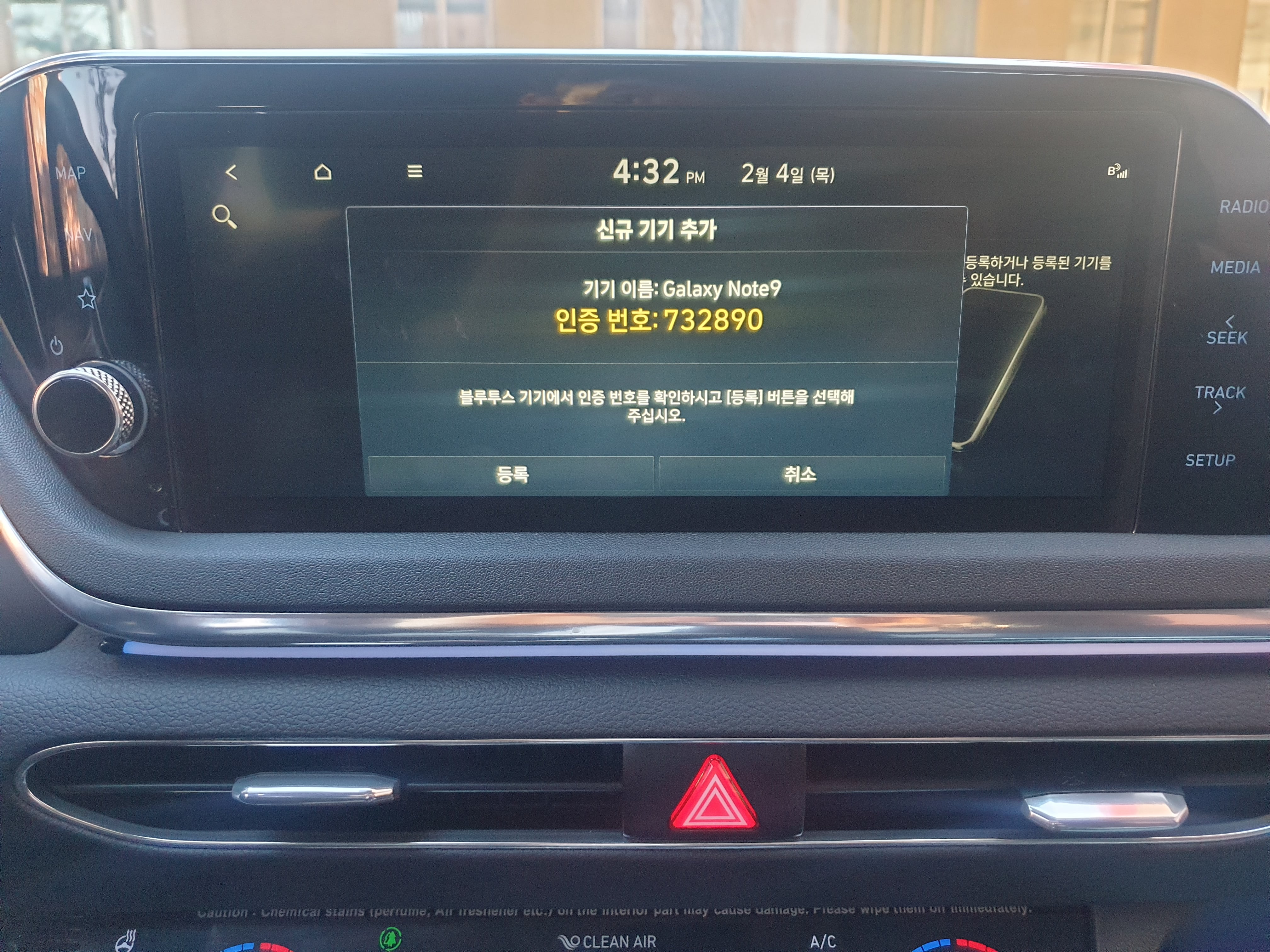 스마트폰 블루투스 등록 화면이 완료되면서 자동차 네비게이션에서도 신규기기추가 화면이 나타나는데요. 스마트폰에서도 동일한 인증번호(설정 시 매번 번호 달라짐)가 같이 보입니다. 등록 눌러주세요.