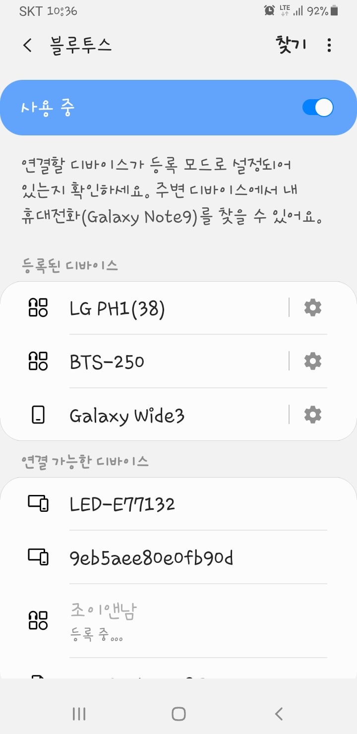 기기연결을 누르시면 신규기기추가 라는 창이 뜨거든요. 저는 시스템 블루투스 정보에 이름을 입력하였기에 저의 이름이 나와있습니다. 이제 가지고 계신 스마트폰에서 블루투스 설정을 해주셔야 하는데요. 스마트폰에 설정에 가서 블루투스 화면으로 들어가 주세요.(블루투스는 꼭 사용 중으로 되어 있어야 합니다)