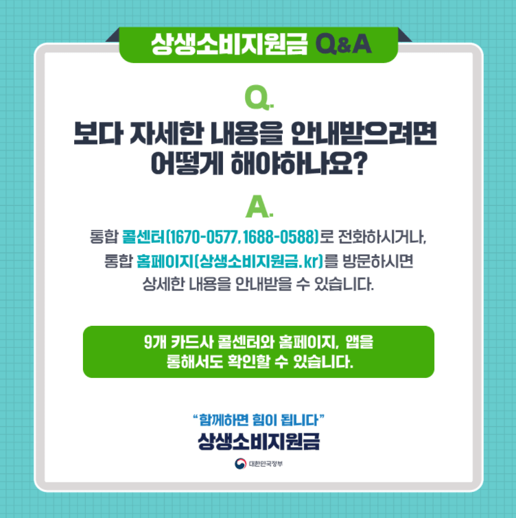 상생 소비 지원금 카드 캐시백 신청방법(상세 설명)에 대해 알려드렸는데요. 유용한 정보가 되었는지요,^^혹시나 이해가 안 되는 부분이나 궁금한 점이 있다면 상생소비지원 대표번호(☎1688-0588 · 1670-0577)로 문의하시면 자세하게 안내 받으실 수 있습니다.