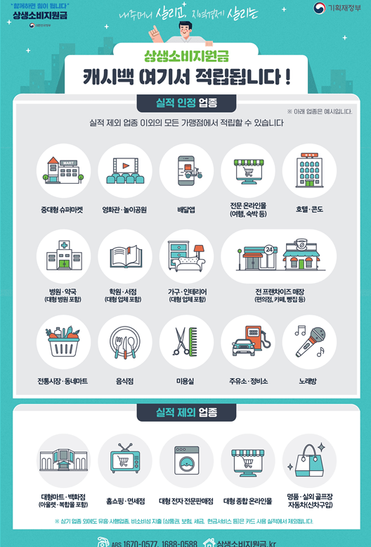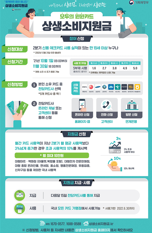 정부가 지역경제 활성화와 소비 회복세를 확산하기 위해 신용카드의 사용액의 10%를 환급해주는 신용카드 캐시백(상생소비지원금) 제도를 10월 1일부터 시행해 소비를 유도하여 경제 회복세를 돕겠다는 취지입니다.