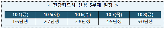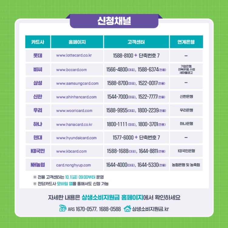 신청방법은 카드사인 롯데, 비씨, 삼성, 신한, 우리, 하나, 현대, KB국민, NH농협 등 9개 카드사는 나이와 2분기 실적 등 신청자격을 확인하여 고객에 통보해 줍니다. 통보를 받은 9개 카드사 중 전담 카드사 하나를 골라 카드사 홈페이지·모바일앱 등 온라인과 콜센터, 오프라인 영업점을 통해 필요한 정보를 확인하고 신청하면 됩니다. 본인 명의 신용카드·체크카드로만 신청할 수 있고 법인·선불·가족 카드는 신청할 수 없습니다.