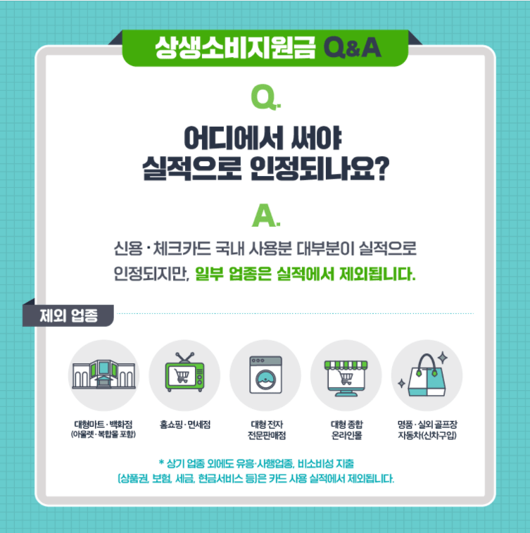 이에 따라 백화점, 대형마트(이마트 홈플러스, 롯데마트, 코스트코, 하이마트, 전자랜드 등), 대형 종합 온라인 쇼핑몰(쿠팡, G마켓, 옥션, 11번가, 위메프 등), 면세점, 대형 전자점 판매점, 명품 전문매장, 휴흥주점, 실외 골프장 및 일부 업종에서는 사용실적에 제외됩니다.