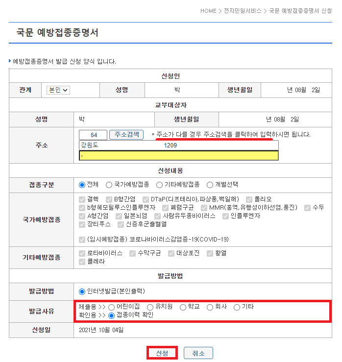 예방접종증명서 발급 신청 양식입니다. 발급받기 전 다시 한번 신청인, 교부 대상자(주소 수정 가능), 신청내용, 발급방법을 확인해 주세요. 그리고 발급방법 → 발급사유에서 제출용, 확인용을 선택할 수 있습니다. 이상이 없다면 아래 신청을 눌러 주세요. 증명서가 신청됩니다.