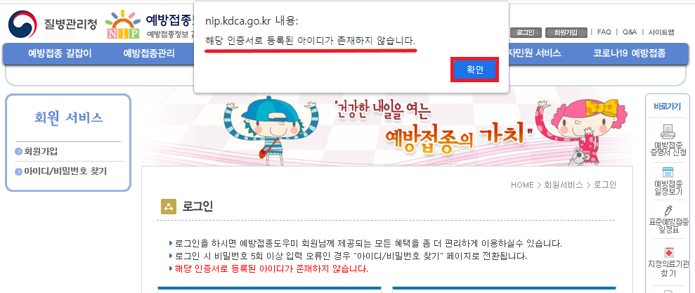 확인 후 '해당 인증서로 등록된 아이디가 존재하지 않습니다.'라는 팝업창이 뜨면 회원가입이 되어 있지 않거나, 또는 인증서가 등록이 되지 않았기 때문입니다.