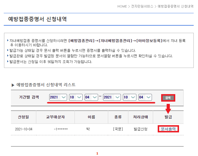 예방접종증명서 신청내역을 출력하기 위해 기간을 넣고 검색을 하면 질병관리청 백신접종확인서가 보입니다. 이제 문서 출력을 눌러 주세요.