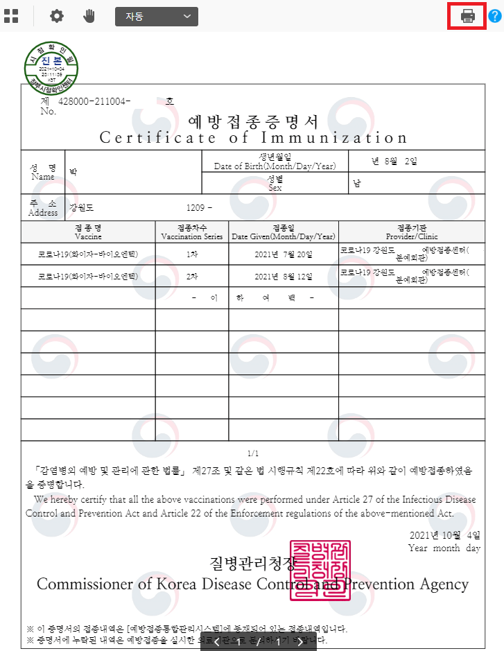 문서출력 누른 후 위 상단에 인쇄를 눌러주면 예방접종증명서가 출력됩니다.