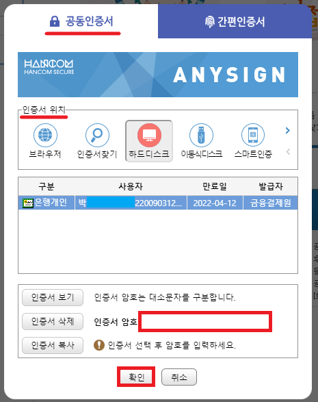 '공동/금융인증서 로그인' 누른 후 공동인증서에서 저장되어 있는 인증서의 위치를 선택하고, 아래 인증서 암호를 입력합니다. 정확하게 인증서 암호 입력하였다면 확인을 눌러 주세요.