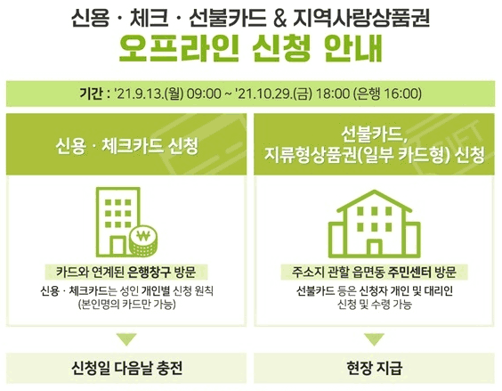 - 신청 및 지급 : 온라인 신청 2021. 9. 6.(월) ~ 2021. 10. 29.(금) / 오프라인 신청 2021. 9. 13.(월) ~ 2021. 10. 29.(금)