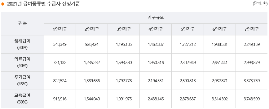 수급권자 가구의 소득인정액이 급여 종류별 수급자 선정기준 이하로 생계급여 30%, 의료급여 40%, 주거급여 45%, 교육급여 50% 해당되는 경우입니다. 아래 표를 보시고 해당이 되는지 확인해 주세요.