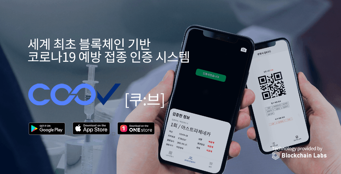 COOV(쿠브)는 질병청에서 발행하는 코로나 19 전자예방접종증명서로, 현재 네이버나 카카오를 활용한 QR 인증이 쿠브의 QR코드를 끌어다 사용하는 것입니다. 쿠브는 QR코드를 통한 접종 증명서 제출이나 상대방 QR코드 검증, 전자증명서 발급 및 백신 인증 등의 기능이 제공되며, 확장성이 큰 퍼블릭 블록체인과 분산신원증명(DID) 기반으로 운영되어 위변조를 불가능하게 하고 사용 이력이 서버에 전혀 남지 않아 프라이버시를 완벽하게 보호합니다.