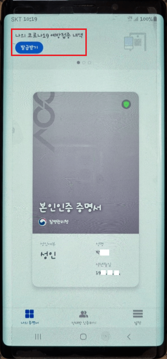 COOV앱 메인 화면입니다. 이곳에서는 내가 접종한 1차, 2차 코로나19 백신접종증명서 내역을 발급받을 수 있습니다. 상단에 발급받기를 눌러 주세요.