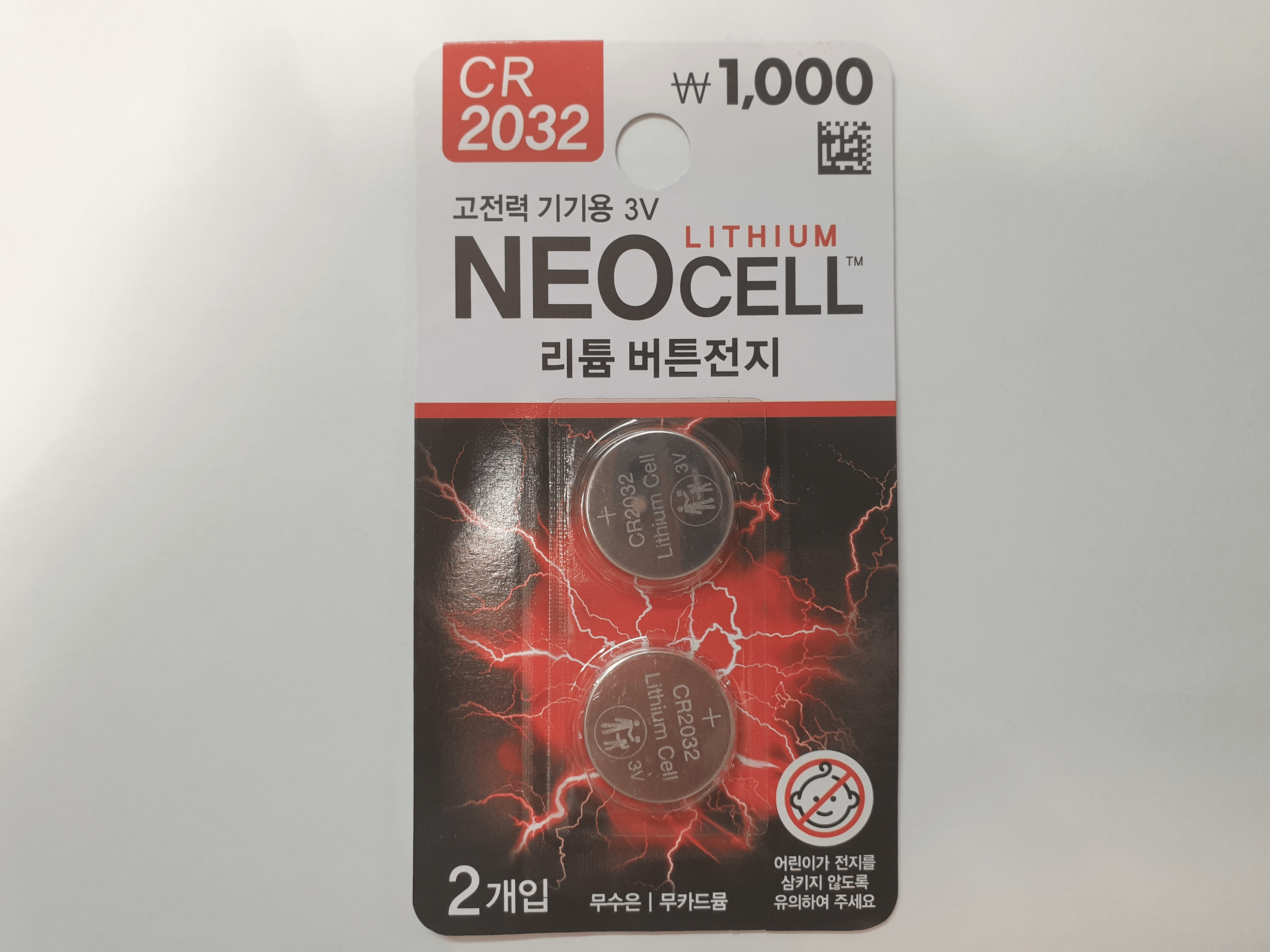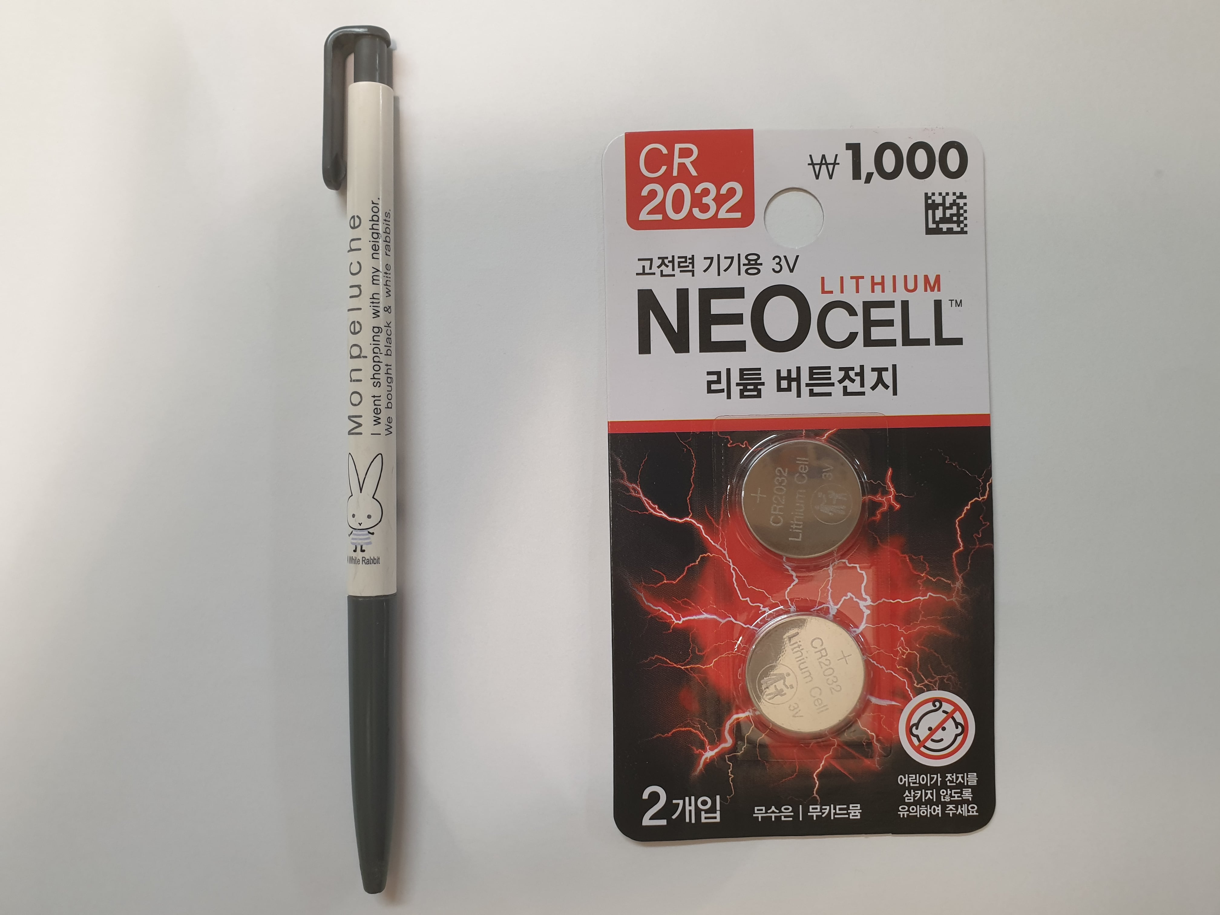 ※ 대부분 CR2032 리튬전지가 많이 사용되며 구입처는 문구사, 대형마트, 다이소 등에서 구입이 가능합니다. 가격은 다이소가 제일 저렴하니 시간 되실 때 하나 사두시면 좋을 것 같습니다.