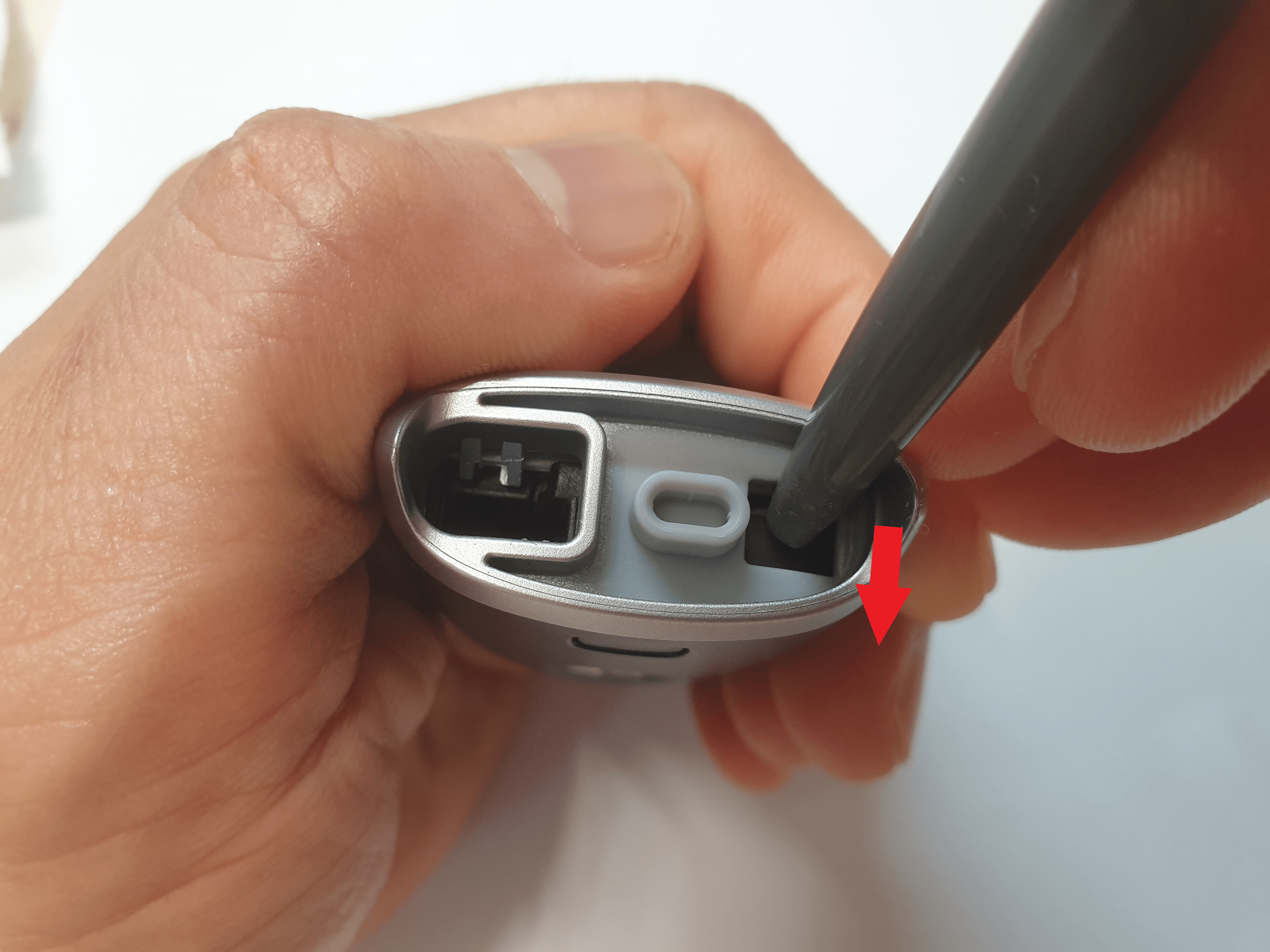 볼펜으로 락 부분을 누르면서 아래로 밀어주세요.(볼펜이 아니어도 스크래치가 안나는 도구를 사용하여 락을 해제할 수 있습니다.)
