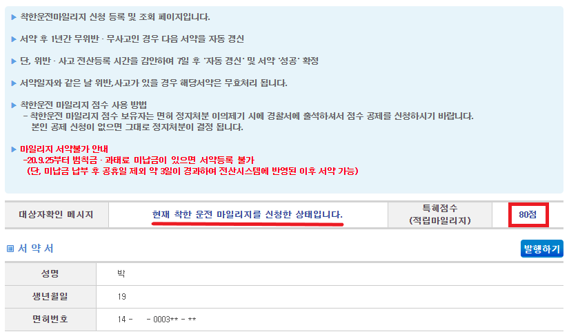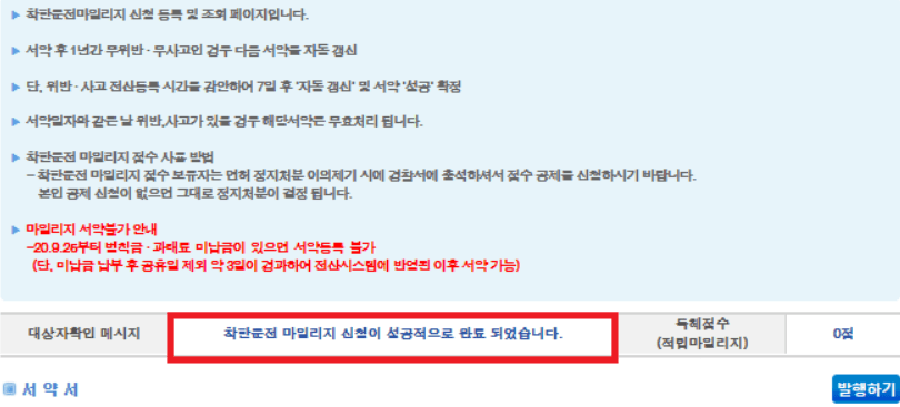 신청 후 대상 확인 메시지 '착한 운전 마일리지 신청이 성공적으로 완료되었습니다.'라고 변경이 되고 발행하기를 눌러 서약 확인서를 확인하고 출력할 수 있습니다.