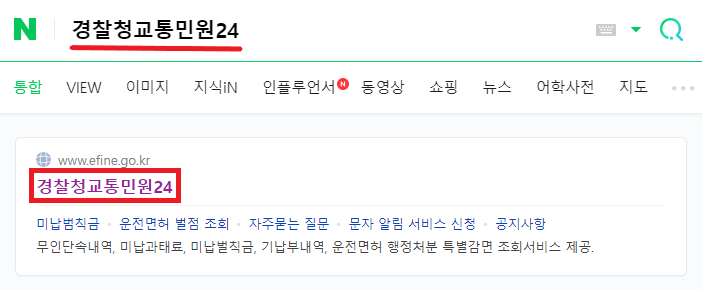 경찰청 교통민원 이파인 사이트에 접속하여 로그인을 하기 위해서는 공인인증서가 꼭 필요하니 사전에 준비하여 주세요. 첫 번째로 자주 이용하는 인터넷 포털 검색창에 '경찰청 교통민원 24'를 입력하고 검색 후 접속하여 주세요.