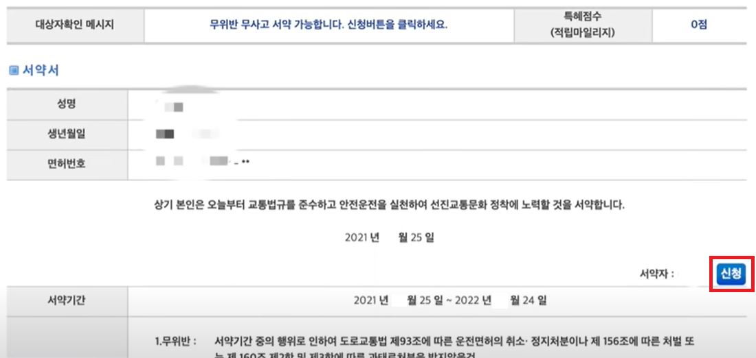 로그인 후 착한 운전 마일리지 신청 등록 및 조회 화면입니다. 서약서 성명, 생년월일, 면허번호를 확인하고 오른쪽 서약자 옆에 '신청'을 눌러 주세요.