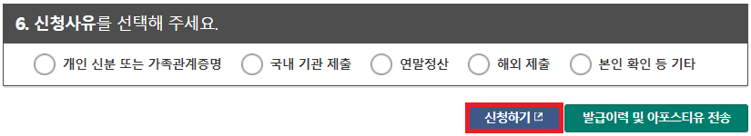 6. 발급하는 신청사유 선택하고 아래 신청하기를 눌러 주세요.