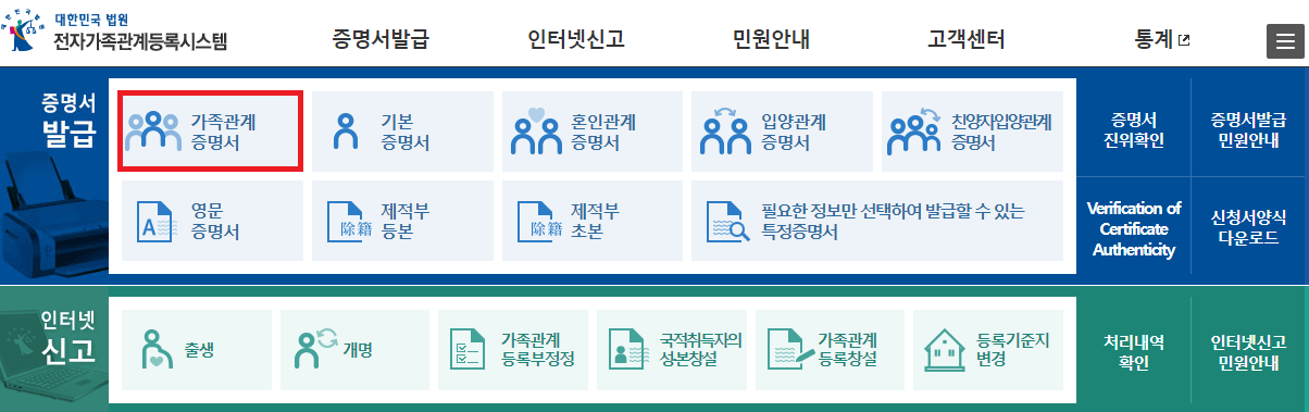 이곳에서 가족관계 증명서를 발급하고 신청할 수 있습니다.