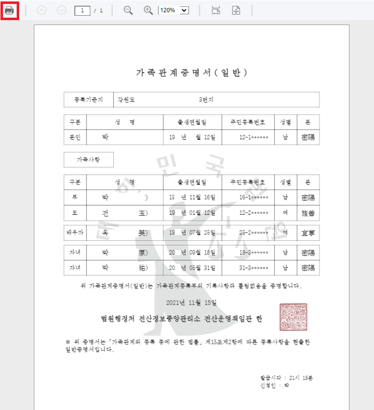 7. 마지막으로 좌측 상단의 인쇄를 눌러 가족관계 증명서를 출력 및 열람할 수 있습니다.
