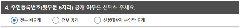 4. 주민등록번호 뒷자리 공개 여부를 선택해야 합니다. 공개해야 할지 비공개해할지 선택이 어렵다면 제출하는 곳에 문의 후 선택해 주시면 됩니다.