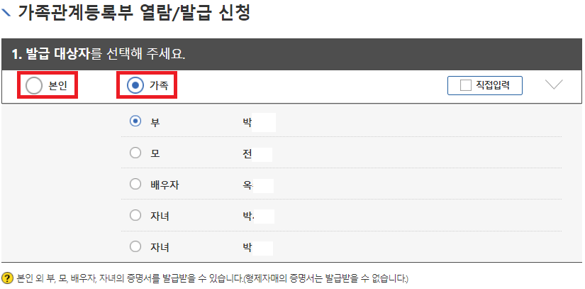 1. 발급대상자 정보 선택란에서 발급 대상자 본인 또는 가족을 선택해 주세요, 가족인 경우에는 자동으로 현출 된 가족 목록을 보고 발급하고자 하는 발급대상자를 선택하면 됩니다.
