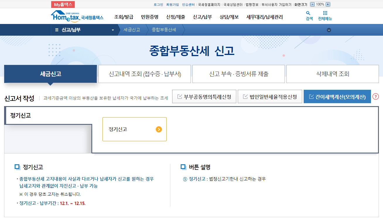 2021년 종부세(종합부동산세) 납부기한은 12월 1일 ~ 15일까지 입니다. 국세청 고지서를 받은 납세자는 과세 물건과 세액계산 상세내역을 확인한 후 신고 여부를 선택할 수 있도록 홈택스와 손택스(홈택스 앱)에서 직접 종부세 조회를 할 수 있습니다.
