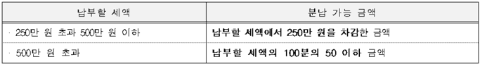 종부세 납부에 부담이 된다면 분납을 이용하시기 바랍니다. 종부세 분납 기준은 농어촌특별세를 제외한 종부세액이 250만~500만 원 이하라면 납부할 세액에서 250만 원을 차감한 금액이 분납이 가능하며, 500만 원을 초과한 경우에도 납부할 세액의 100분의 50 이하 금액을 분납할 수 있습니다.
