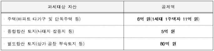 종부세 과세 기준일인 6월 1일에 주택을 소유한 자로 과세대상 자산은 ▷주택(아파트·다가구,·단독주택)등의 경우 6억 원(1세대 1 주택자는 11억원), ▷종합합산 토지(나대지·잡종지)등은 5억원, ▷별도합산 토지(상가·공장 부속토지 등)는 80억원이 공제됩니다.