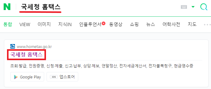 1. 자주 이용하는 포털 검색창에 "국세청 홈택스"를 입력하고 접속하여 주세요.