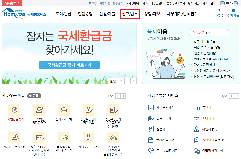 2. 국세청 홈택스 홈페이지 메인 화면입니다. 종부세 과세대상 조회를 하기 위해 상단 메뉴에 신고/납부를 클릭해 주세요.