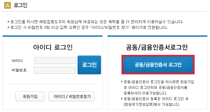 5. 질병관리청 예방접종 도우미 서비스를 로그인해야 이용이 가능합니다. 공동/인증서를 이용하여 로그인을 진행하여 주세요.