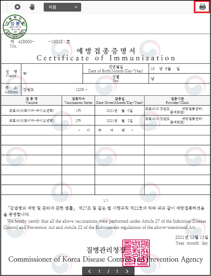 10. 마지막으로 우측 상단에 인쇄 버튼을 클릭하면 질병관리청 예방접종증명서 발급이 완료됩니다.