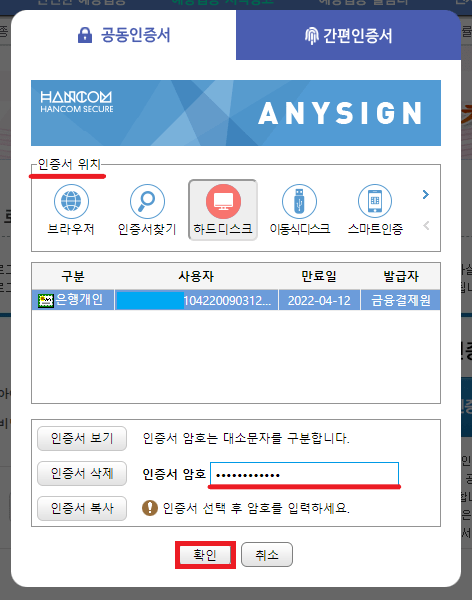 6. 공동/금융인증서 로그인 클릭 후 인증서 위치 선택 → 인증서 암호 입력 → 확인을 눌러 주세요.