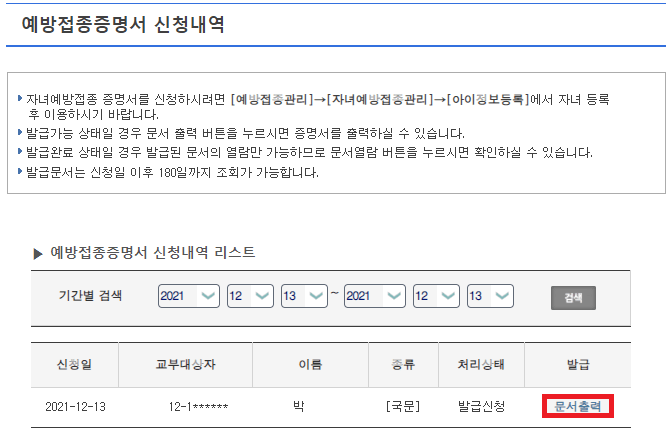 9. 증명서가 신청되고 예방접종증명서 신청내역을 확인할 수 있습니다. 증명서를 출력하기 위해 문서 출력을 클릭해 주세요.