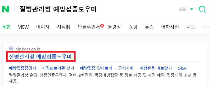 1. 첫 번째로 자주 이용하는 포털 검색창에 '질병관리청 예방접종 우미'를 입력하고 검색해 주세요.