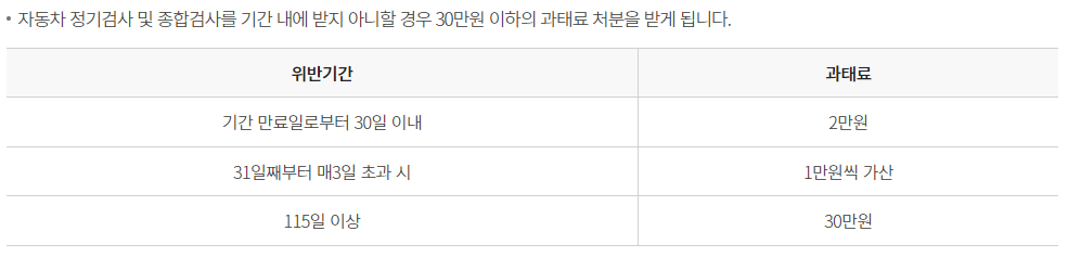 만약 115일 이상 경과 시에는 최고 과태료 금액은 30만 원에서 60만 원으로 2배 늘어나니 꼭 정기검사 및 종합검사를 받아주시기 바랍니다.