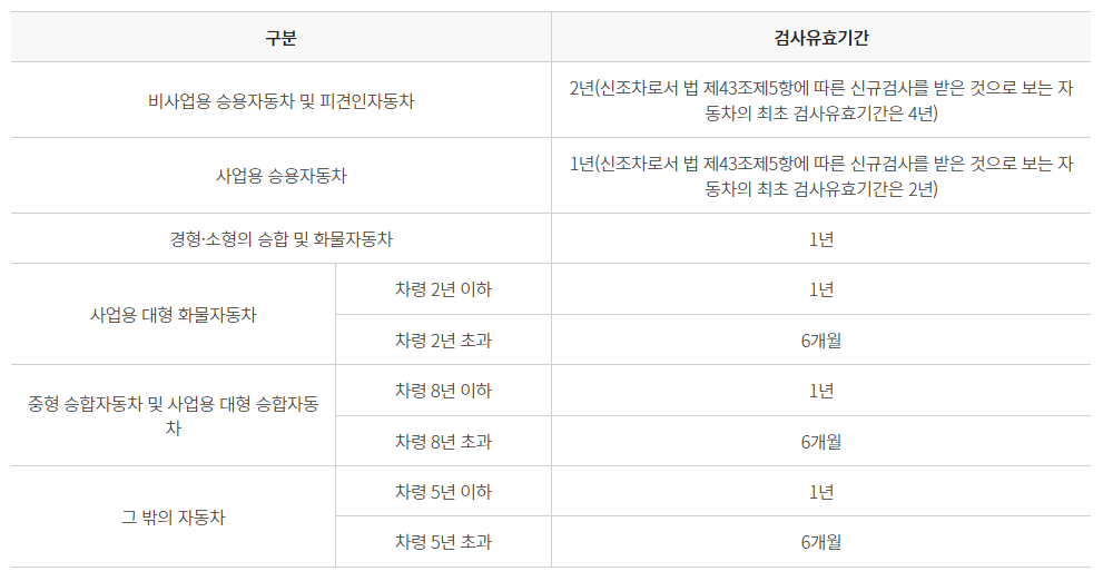 그 밖의 자동차 ▶ 차량 5년 이하 1년, 5년 초과 6개월 정기검사 대상입니다.