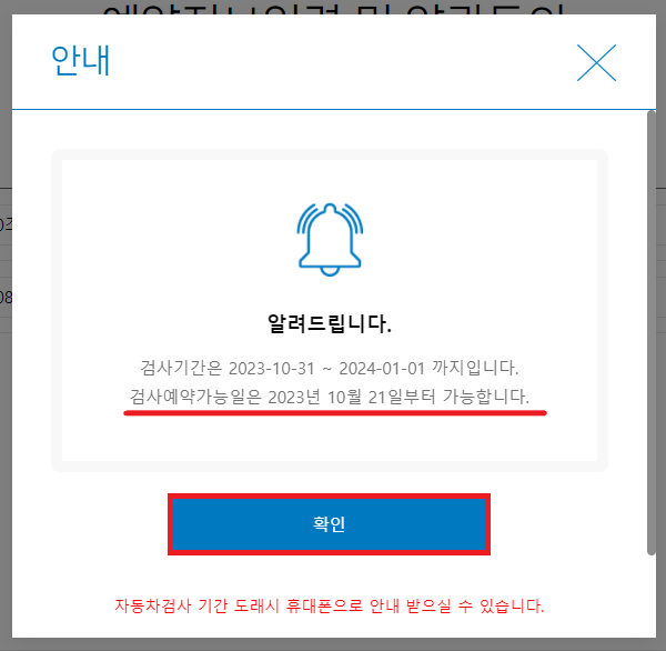 차량 조회를 클릭 후 검사소와 날짜를 선택하고 결제를 진행하면 예약이 완료됩니다. 공단에서 예약 하루 전 문자(SMS)를 발송되고 예약시간에 맞춰 자동차 검사소에 차량등록증과 보험가입증을 꼭 지참하여 방문해 주시면 됩니다. 저는 차량을 구매한 지 2년이 조금 넘어 현재는 자동차검사 대상이 아니라고 확인이 됩니다.