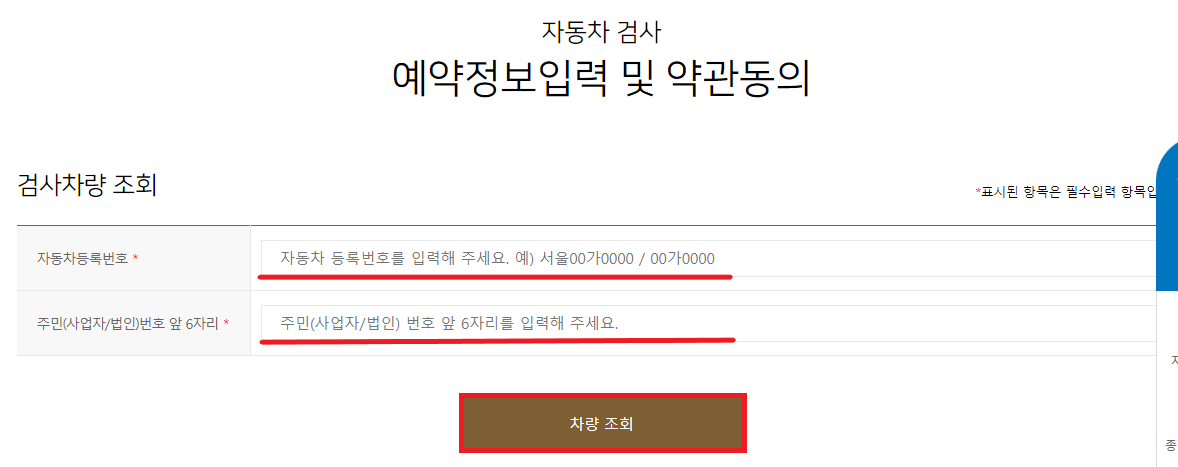 자동차 검사 예약정보 입력 및 약관 동의를 위해 검사차량 조회를 해야 합니다. 차량등록증을 확인하여 자동차 등록번호와 주민번호 앞 6자리를 입력해 주세요. 정확이 입력되었다면 '차량조회'를 클릭합니다.