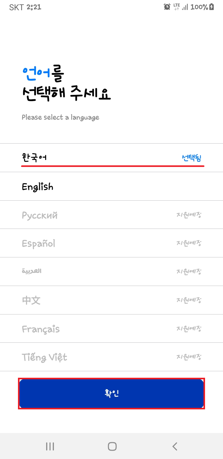 실행 후 COOV 앱을 사용할 언어를 선택해야 합니다. 한국어를 선택하고 '확인'을 눌러 주세요.