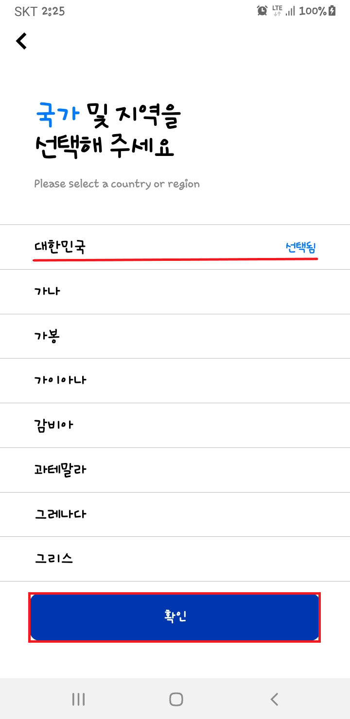 COOV 앱을 사용할 국가 및 지역을 선택해야 합니다. 대한민국을 선택하고 '확인'을 눌러 주세요.