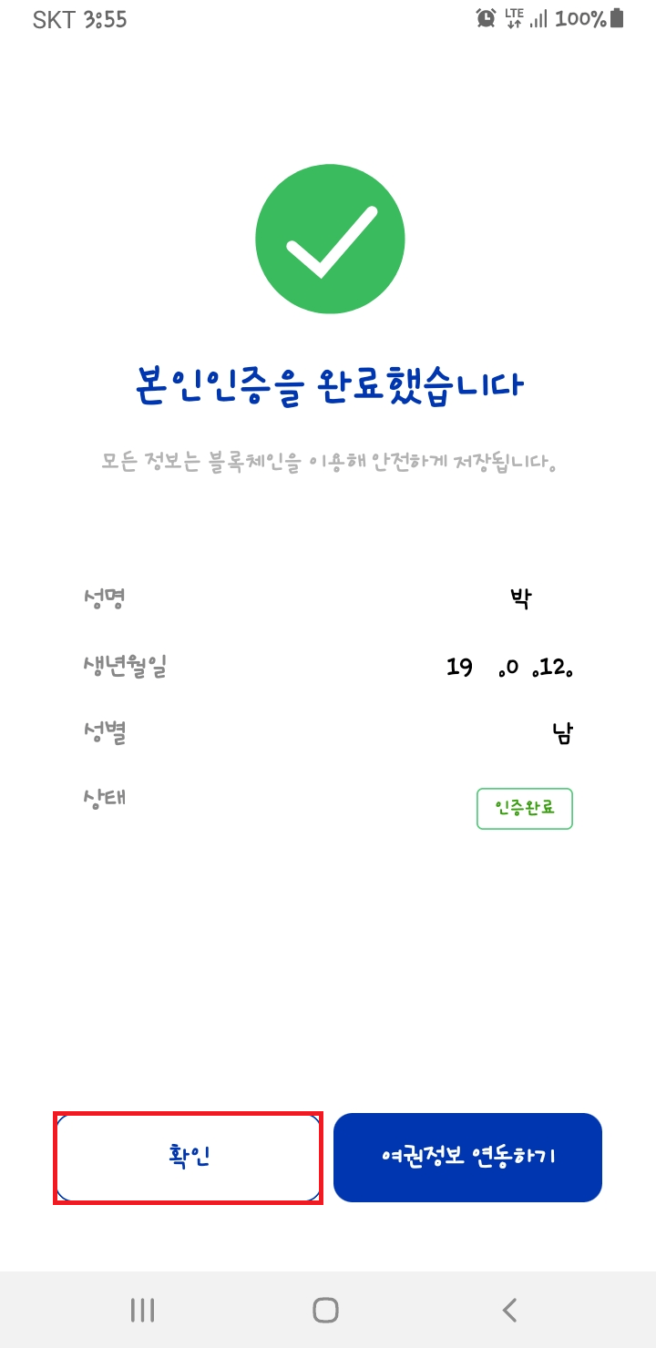 본인 인증이 완료됩니다. '확인'을 눌러 주세요.