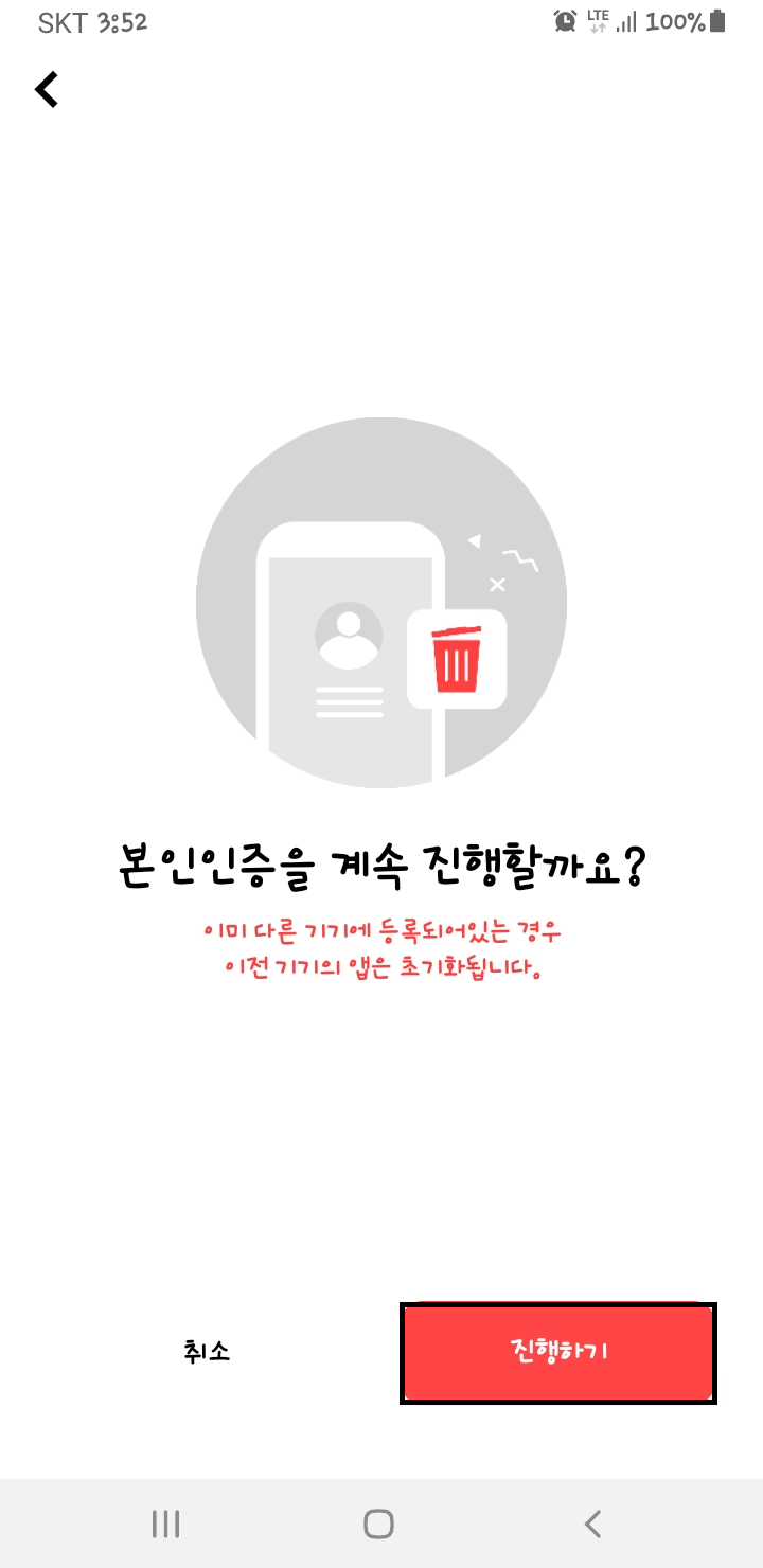 본인인증을 계속 진행할까요? 질문에 '진행하기'를 눌러 주세요.