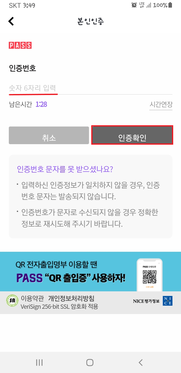 본인 확인을 위한 인증번호 6자리가 메시지로 수신됩니다. 인증번호를 입력하고 '인증 확인'을 눌러 주세요.