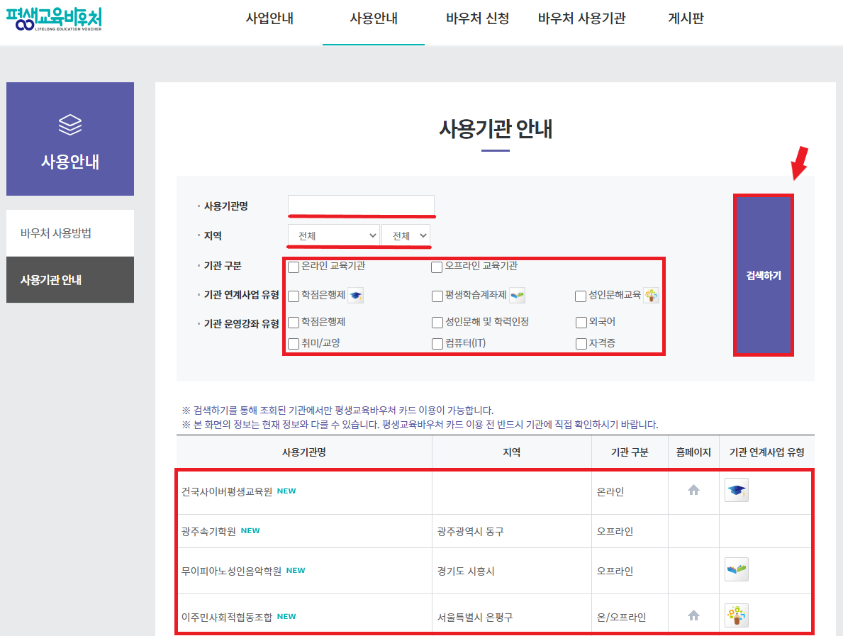 사용기관 검색 방법은 평생교육바우처 홈페이지 접속 → 상단 메뉴 사용 안내 클릭 → 사용기관 안내 클릭