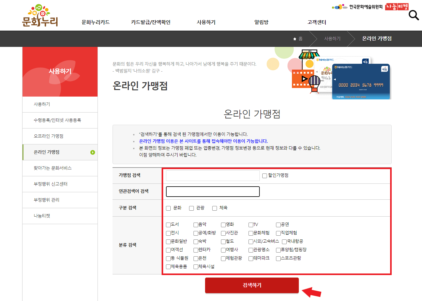 ※ 참고로 포털사이트에서 일부 온라인 가맹점 검색 후 접속하시는 경우 결제가 되지 않을 수 있으니, 반드시 문화누리카드 홈페이지→ 사용하기 → 온라인 가맹점 바로가기 링크를 통해 접속 및 결제를 해주세요.