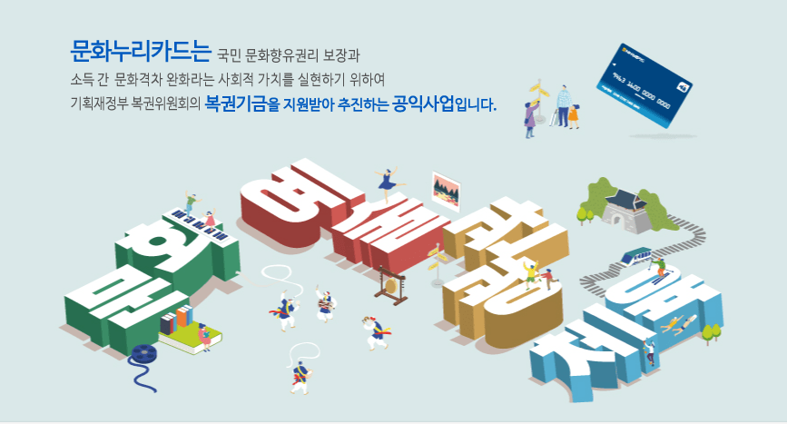 문화누리카드란? 삶의 질 향상과 문화격차 완하를 위해 기초생활수급자와 차상위계층을 대상으로 발급하는 카드로 문화·여행·체육활동을 비롯해 국내 여행 등에 사용할 수 있도록 1인당 연간 10만 원을 지원하는 사업으로 문화누리카드를 소지하고 있다면 다양한 곳에서 쓰임새 있게 문화적 혜택을 누릴 수 있습니다. 그럼 자세하게 알아보도록 하겠습니다.