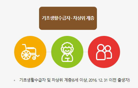 - 기초생활수급자 및 차상위 계층(6세 이상, 2016.12.31 이전 출생자)