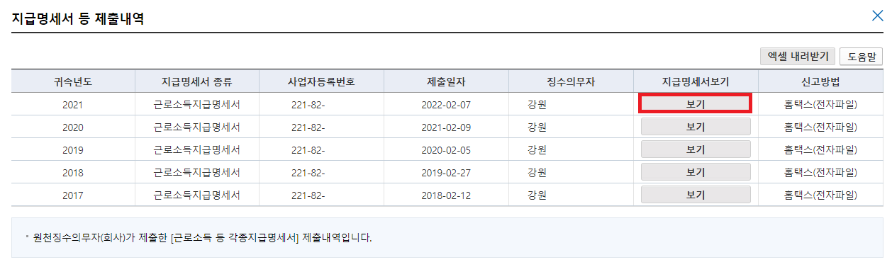현재 제가 근무하고 있는 회사에서 근로소득 등 각종 지급명세서 등을 제출한 내역으로 이전 2017년 ~ 2021년까지 지급명세서(연말정산 환급금)를 확인할 수 있습니다. '보기'를 눌러 주세요.