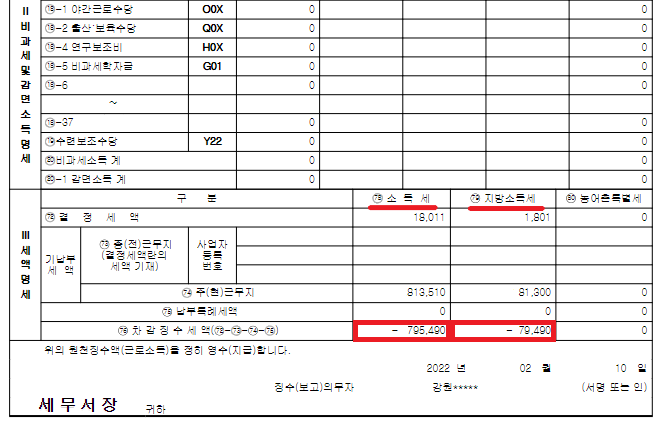 2021년 근로소득 지급명세서를 내용을 확인하고 인쇄를 눌러 발급할 수 있습니다. 이제 제일 중요한 2021년 13월 월급인 연말정산 환금 금액을 확인해야 하는되요. 확인방법은 맨 아래 세액 명세를 보게 되면 소득세, 지방세 아래 차감징수세액이 마이너스로(-) 되어 있으면 돌려받게 되고 반대로 플러스(+)가 되어있으면 세금을 더 내야 합니다.